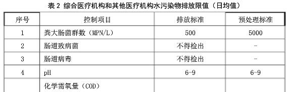 2、縣級(jí)及縣級(jí)以上或20張床位及以上的綜合醫(yī)療機(jī)構(gòu)和其他醫(yī)療機(jī)構(gòu)污水排放執(zhí)行表2的規(guī) 定。直接或間接排入地表水體和海域的污水執(zhí)行排放標(biāo)準(zhǔn),排人終端已建有正常運(yùn)行城鎮(zhèn)二級(jí)污水 處理廠的下水道的污水,執(zhí)行預(yù)處理標(biāo)準(zhǔn)。